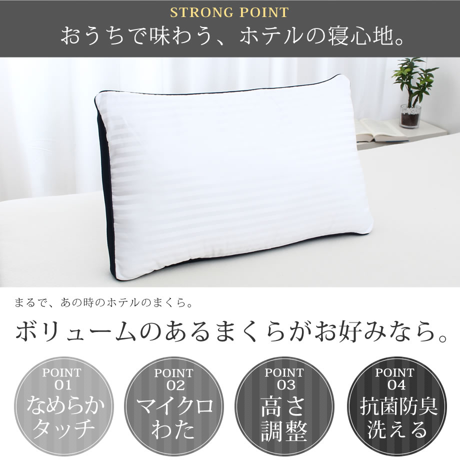 LUXURY STYLE ホテルまくらシリーズ一覧 商品詳細 サイズ 約43×70×15.5cm 組成 まくら本体 表側:ポリエステル100% 裏側:ポリエステル100% マチ部分:ポリエステル100% 中材:ポリエステル100%(マイクロわた) シート部分 側地:ポリエステル100% 中材:ウレタンフォーム 総重量 約1.13kg メーカー (株)タナカふとんサービス 生産国 中国製 商品仕様 ウレタンフォーム製高さ調整シート2枚入、抗菌防臭加工(側生地)、洗濯機可能(ネット使用/ウレタンフォームは洗えません) 商品説明 ボリュームのあるまくらがお好みの方におススメする「ホテルまくら」シリーズ。